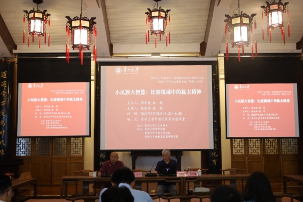 2023年9月28日下午,由贵州大学人文社科处主办,贵州大学哲学学院、贵州大学中国文化书院、贵州大学佛教量论因明研究院承办的贵州大学“文科讲坛”第九十三期暨哲学学院“国慧”哲学之光系列讲座第四十五讲在中国文化书院勉学堂成功开讲。教育部“长江学者”特聘教授、教育部人文社科基地山东大学犹太教与跨宗教研究中心主任、中国宗教学会副会长、山东大学哲学与社会发展学院傅有德教授应邀主讲。讲座主题为“小民族大智慧:比较视域中的犹太精神”,由中国逻辑学会因明专业委员会主任、贵州省宗教学会会长、贵州大学哲学学院张连顺教授主持。