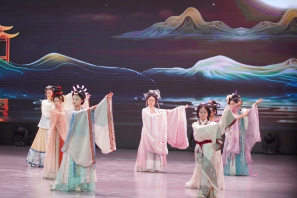 唐代温庭筠有诗云:舞转回红袖,歌愁敛翠钿;满堂开照曜,分座俨婵娟。《霓裳》汉服走秀表演中,同学们穿插着富有古风韵味的舞蹈。飞花飘絮,霓裳翩翩舞,几多情愫心飞扬。广袖流云,琴曲指尖凝,清水芙蕖脱尘嚣。起舞弄清影,何似在人间。