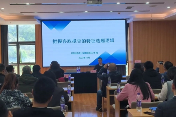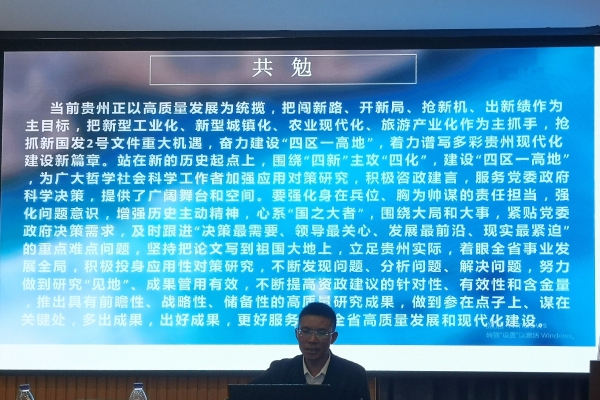 贵州省社科联《贵州咨政》编辑部主任杨海作交流主题报告,围绕咨政报告研究的鲜明特征、研究选题、基本逻辑详细地介绍了资政报告撰写技巧,介绍了近期咨政报告的重点研究选题,为各基地主任围绕“四新”、主攻“四化”,立足贵州实际、积极献言建策,提供了重要的参考借鉴。