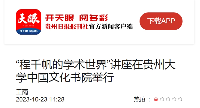 为纪念著名学者程千帆诞辰110周年,10月21日,由贵阳孔学堂、贵州大学文学院联合主办的“程千帆的学术世界”讲座暨《程千帆全集》新书分享会在贵州大学中国文化书院勉学堂举行。