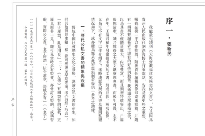 贵州大学中国文化书院荣誉院长张新民教授作“序一”并推荐认为,《天海斋藏福建家族契约文书》不仅体量庞大,内容丰富,而且类型特征突出,户属形态清晰,诚乃难得之大型文献整理专书。(王涛)前后耗费十余年辛劳精力,积帙合编竟以上万计,乃有此煌煌资料纂辑之专书,为不断累积增多的福建文书整理成果,再添一份值得称道的青年学人成绩,而可以看到近百年来之学术发展大势,总是前启后承不断有新人崛起。