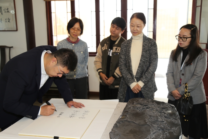 参观结束,沈海涛在仁文厅提笔留言:传习心学,勇于创新。
