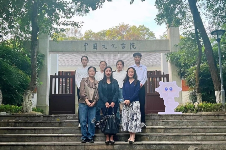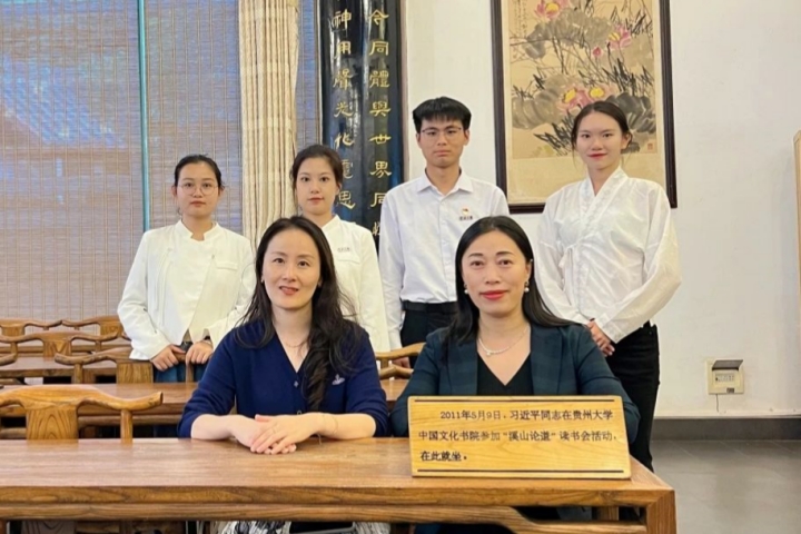 在中国文化书院,师生党员参观了孔子铜像、贵州教育文化鼻祖尹珍先生塑像、贵州大学前身“贵山书院”石刻,并在勉学堂、励道楼、合一亭、涵远读书楼、仁文厅等文化设施中感悟蕴含的中国文化元素,深入了解王阳明居黔期间龙场悟道的历史和阳明文化遗产保护,就团队如何在新的阶段更好地传播浙东红色文化展开讨论。在勉学堂,师生们重点学习了习近平同志曾在这里参加“溪山论道”读书会活动时的讲话,并在总书记曾经就坐的地方合影留念。