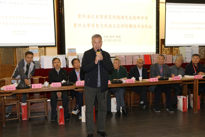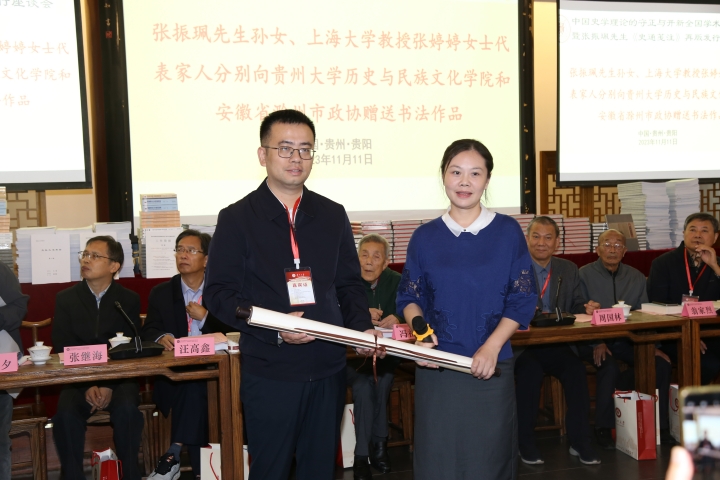 贵州大学中国文化书院荣誉院长、贵州省儒学研究会会长张新民教授向贵州大学历史与民族文化学院、贵州大学中国文化书院赠送《史通笺注》(上、下)《天柱文书》(第一辑,22册)《清水江乡民家藏文书考释》(第一辑,18册)《赫章古彝文献合集》(80册)等大型研究成果类图书;上海大学教授张婷婷、贵州省文史馆馆员陈德谦致辞,分别向贵州大学历史与民族文化学院、张振珮先生祖籍所在地安徽省滁州市政协等赠送书法书画作品;贵州播雅书院院长石行现场吟诵陈德谦和张振珮先生诗作。