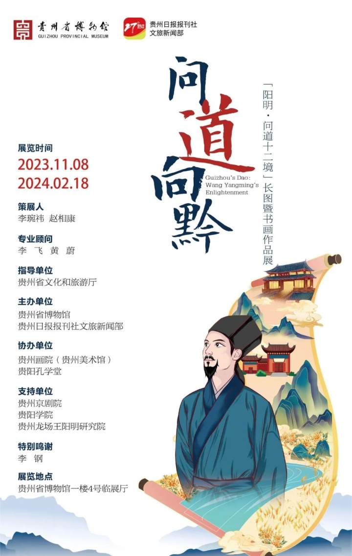 本次展览通过展示当代名家创作的阳明文化相关书画雕塑作品,辅以不同时期阳明文化遗迹的拓片、阳明漫画作品,并根据王阳明在贵州的活动轨迹和主要经历,结合中共贵州省委宣传部、贵州省新闻出版局、贵州省版权局发布的“阳明·问道十二境”文化IP创作的手绘长图,串联起一代大儒王阳明在贵州的行迹事件,让人在真山真水的实景图片间感受王阳明悟道传道的心路历程,探寻多彩贵州这片土地上中华优秀传统文化发展的一条重要历史脉络。