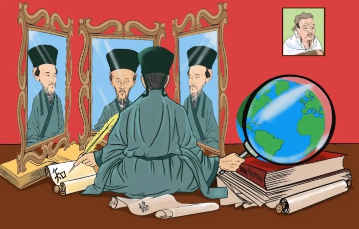 通过漫画的夸张手法,艺术家让阳明左手执鹅毛笔杆书知,右手拿放大镜观看放在象征知识的书籍上的地球仪,而在地球仪上方的孔子像表示了阳明学的师承。这幅作品很好地体现了中国圣贤的天下观:一面自我审视,一面不忘观察世界。