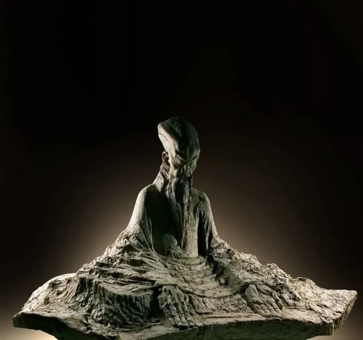 创作思路:阳明像的构成源于贵州大山,裳袍如贵州的喀斯特地貌,又似梯田或步步登高的阶梯。雕塑底部弧线极具升腾感,是阳明作为圣人的表达。阳明冠帽正大,上可接天,躯干含胸拔背双目微闭,胡须垂长已化为利剑从肚脐刺入身体正破心贼。阳明伸出的双手,一阴一阳坦荡光明。贯穿雕像的龟裂,粗细不同若隐若现,如贵州曲折的山路,更像阳明神龙见头不见尾的思维导图。
