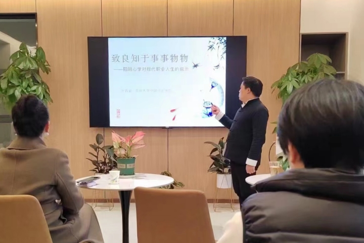 为更好地服务社会,2023年11月30日,贵州大学中国文化书院(阳明文化研究院)校聘副教授暨贵州大学中华传统文化与贵州地域文化研究中心专职研究员刘青衢博士受贵州黔鼎鼎律师事务所邀请,在该律所会客厅为30多名来自律师、高校、企业、社区、媒体等行业的社会各界人士讲解了阳明心学的现代价值。讲座主题为:“致良知于事事物物——阳明心学对现代职业人生的启示”。此次讲座是贵州黔鼎鼎律师事务所长期举办的“鼎悦会”文化分享活动之一。
