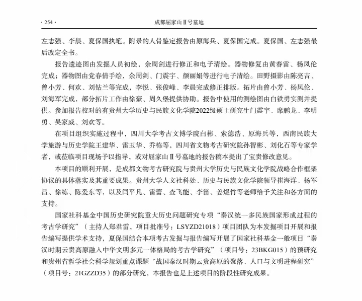 日前,由成都文物考古研究院、贵州大学历史与民族文化学院共同编著,贵州大学历史与民族文化学院教授、贵州大学中华传统文化与地域文化研究中心兼任研究员夏保国等主编的《成都屈家山II号墓地》考古发掘报告由科学出版社正式出版发行。这是贵州省第一部由高校教师主编出版的完整的田野考古发掘报告,彰显了贵州大学考古文博专业学科建设取得的新成绩,为贵州大学和贵州省考古文博学科考古文博人才培养夯实了基础。