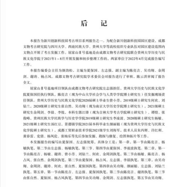 贵州大学历史与民族文化学院近年通过与中国科学院古脊椎与古人类研究所、成都文物考古研究院、贵州省文物考古研究所、宁波市文化遗产管理研究院等高水平学术科研机构的合作,在四川成都、云南元谋、贵州贵安新区、浙江宁波等地开展了扎实、全面、高质量的考古文博人才实操实训培养。通过这一实践教学的模式,贵大考古文博学科近年来向吉林大学、四川大学、中山大学、南京大学等“双一流”高校的考古文博专业输送了7名硕士毕业生攻读博士学位。担任《成都屈家山II号墓地》考古发掘报告副主编的2018级硕士研究生陈亮吉、2020级硕士研究生吴功翔即已分别以优异成绩考取中山大学、南京大学博士研究生继续深造。随着成都文物考古研究院等单位与贵州大学考古文博学科团队合作的深入,相信将会获得更加丰硕的学术成果,将有更多的优秀学子从田野考古的广袤沃土中脱颖而出。