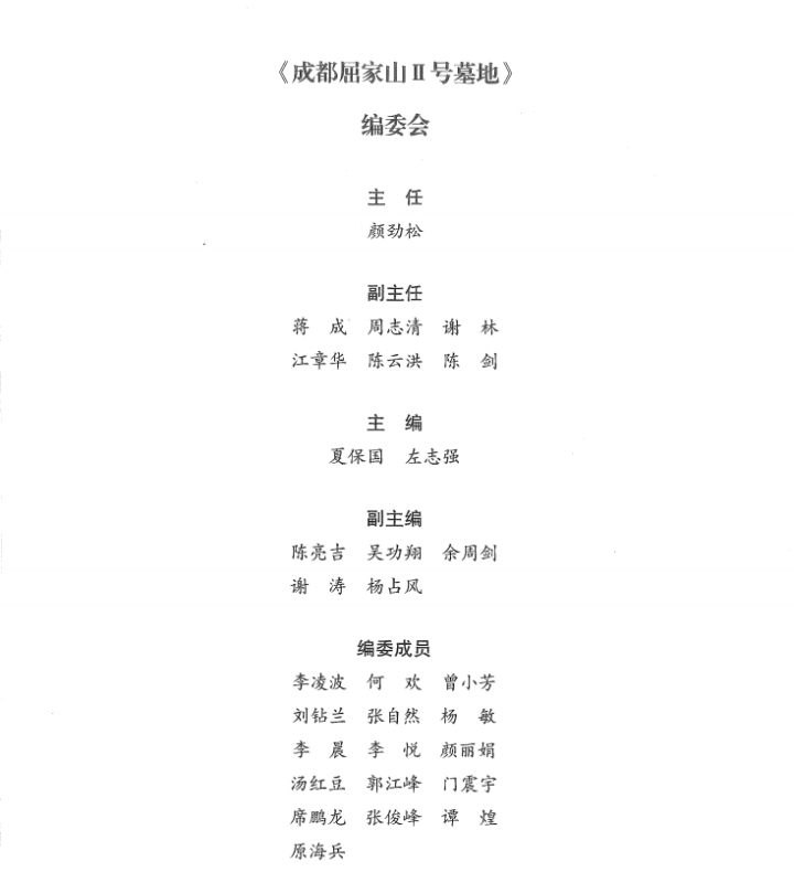 考古发掘报告是考古工作和考古团队最重要的学术成果之一。《成都屈家山Ⅱ号墓地》考古发掘报告的编委会主任由成都文物考古研究院院长颜劲松担任,主编为贵州大学夏保国教授、成都文物考古研究院副研究员左志强,副主编为陈亮吉、吴功翔、余周剑、谢涛、杨占风;编撰团队主要由贵州大学历史与民族文化学院在读硕士研究生和本科生组成。