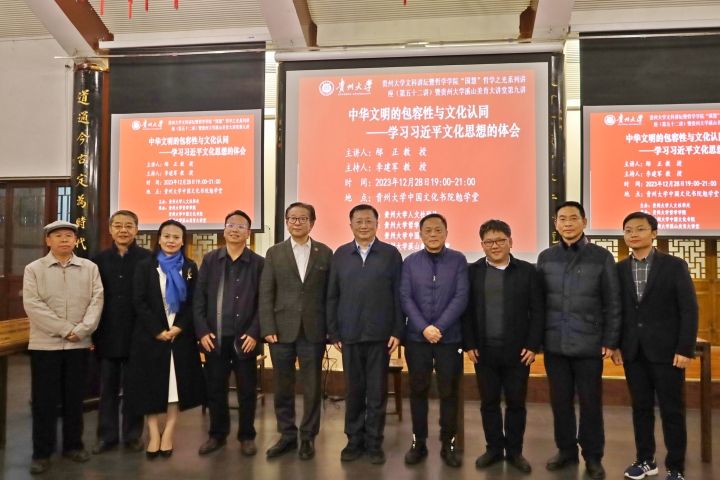 2023年12月28日晚,由贵州大学人文社科处主办,贵州大学哲学学院、贵州大学中国文化书院、贵州大学溪山美育大讲堂承办的贵州大学文科讲坛暨哲学学院“国慧”哲学之光系列讲座(第五十二讲)贵州大学溪山美育大讲堂第九讲在贵州大学中国文化书院勉学堂举行。