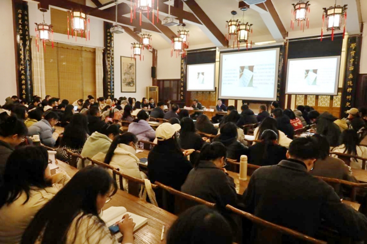 李建军教授作总结发言,指出本次讲座内涵丰富,融通文史、贯穿中西,为参与讲座的师生提供了一场视觉盛宴,并对邴正教授应邀主讲表示了由衷的感谢。