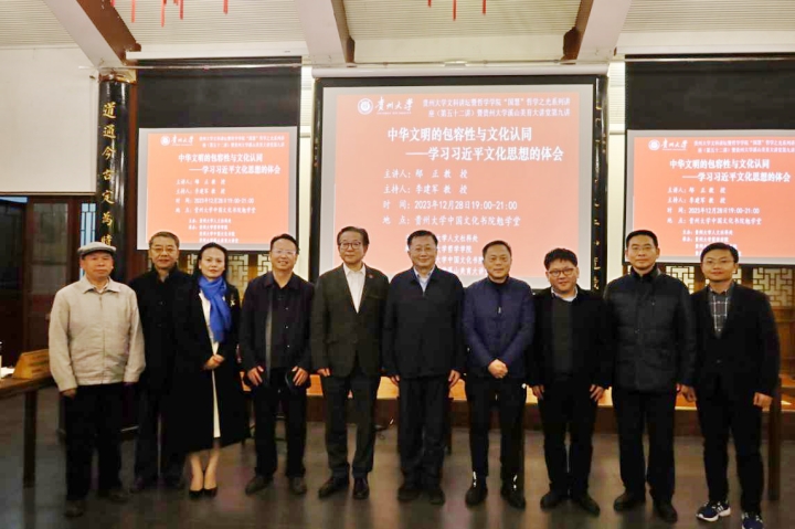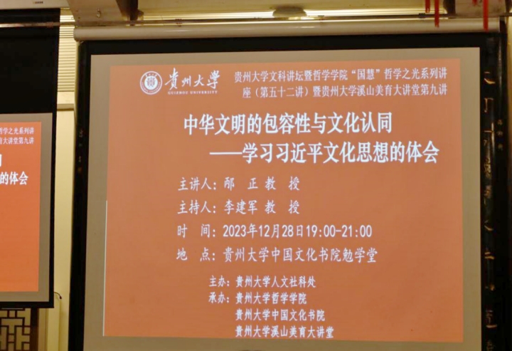 2023年12月28日晚上,“中华文明的包容性与文化认同——学习习近平文化思想的体会”讲座于贵州大学中国文化书院勉学堂成功开讲。吉林大学校务委员会副主任、东北振兴发展研究院院长、中国马克思恩格斯研究会副会长、中国社会学会学术委员会副主任、国家高端智库首席专家、吉林大学匡亚明卓越教授邴正教授应邀主讲,讲座由贵州省第十四届人民代表大会教育科学卫生文化委员会副主席委员、贵州大学李建军教授主持。