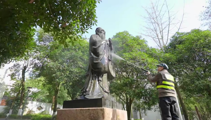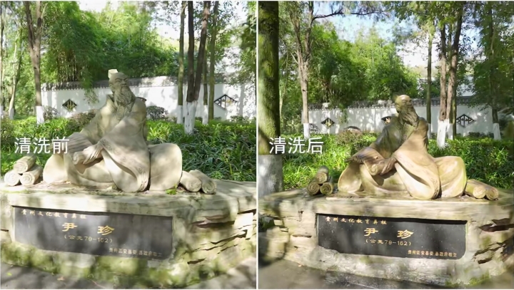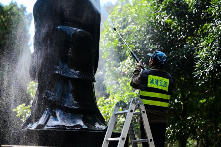 无论何种材质,当雕塑长时间置于户外,堆积的灰尘和污渍若无法得到及时且有效的清洗,长此以往便会沉积在雕塑表面,使其褪去了往日光彩。贵阳冰清玉洁凭借20年清洁经验和自身过硬的专业知识,在与卡赫专家团队进行实地考察与评估后,为贵州大学东校区18座雕塑量身定制了针对性的清洁解决方案,在充分保护雕塑不被损坏的同时,也能对雕塑进行干净彻底的清洁。