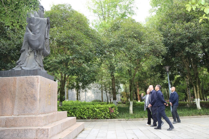 在书院大门前,新疆教育厅领导考察中国文化书院大门正前方的孔子铜像,体会作致礼状铜像所表达的中国传统儒家文化“仁爱、正义、中正、和谐”理念;参观尹珍先生塑像,听取自贵州教育文化鼻祖东汉尹珍先生首创务本学堂以来,至明清时期龙冈书院、阳明书院、贵山书院等所形成“六千举人,七百进士”贵州教育文化历史盛况;参观“贵山书院”石刻,听取其所体现贵州大学“书院—学堂—大学”百廿余年历史文化一脉相承的介绍。