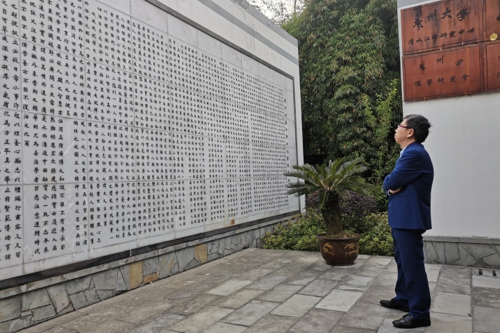 荣誉院长张新民先生重点为田卫平先生介绍了香港孔教学院汤恩佳博士所赠孔子铜像的落成过程、国家图书馆原馆长任继愈先生及孔子嫡传后人孔德成先生所题写院名及所赠对联情况,介绍张新民先生所亲撰《贵州大学中国文化书院学规》和《贵州大学中国文化书院条规》及其被收录到《中国书院学规集成》的情况。田卫平教授久久驻足于勉学堂前,特别认真地仔细阅读《学规》碑刻和《条规》木匾并深入了解其学术主张与行为规范内涵。