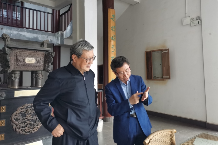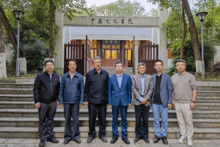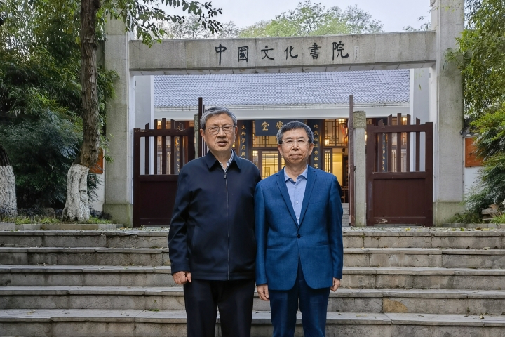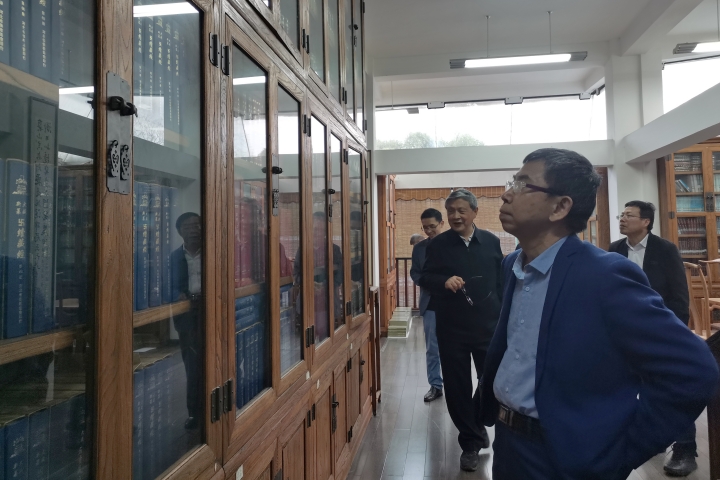 荣誉院长张新民先生向田卫平先生介绍所亲撰勉学堂后侧联“养乾坤正气育天下英才”和涵远读书楼自撰联“溪流智水消心火山送仁风扫世尘”,就对联相关寓意、中国古代书院制度和文化精神尤其是书院在现代的发展等问题作了深入交流,回顾在鹿鸣楼接待多位著名学者的诸多往事。众人还一起登上涵远读书楼,参观书院所藏《四库全书》《乾隆大藏经》以及《道藏》《儒藏》等大型经典丛书并了解其利用情况。