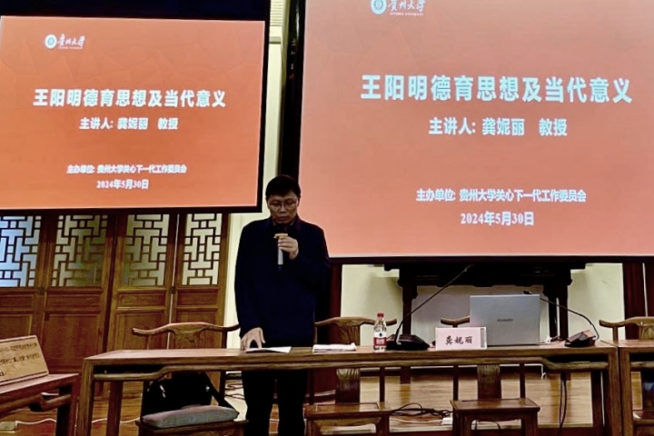 2024年5月30日晚,由贵州大学关心下一代工作委员会精心组织的“王阳明德育思想及当代意义”主题讲座在贵州大学中国文化书院勉学堂如期举行。讲座特别邀请贵州大学原人文学院中文系三级教授、美学硕士生导师、贵州大学中国文化书院(阳明文化研究院)兼任研究员龚妮丽老师主讲,贵州大学离退休党委书记、贵州大学关心下一代工作委员会副主任邓雄主持。