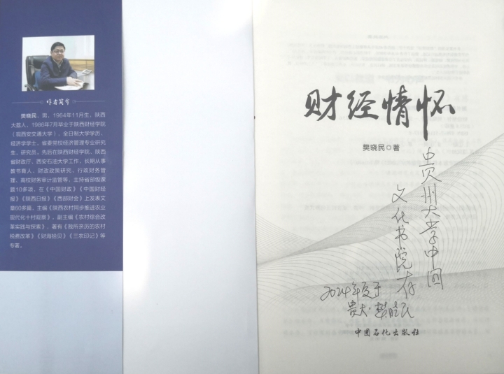 贵州大学中国文化书院获赠樊晓民著《财经情怀》一书