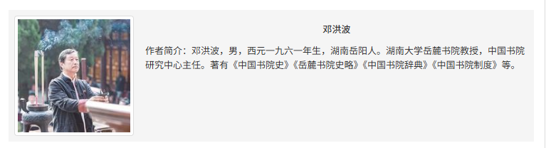 邓洪波,湖南大学岳麓书院二级教授,博士生导师,享受国务院政府特殊津贴专家。现任岳麓书院学术委员会副主任、湖南大学古籍整理研究所所长、中国四库学研究中心主任、中国书院研究中心主任,中国书院学会副会长、湖南省社科重点基地中国四库学研究基地首席专家、湖南省高校社科重点基地书院文化研究与传播中心首席专家。著有《中国书院史》、《中国书院制度研究》(合)、《湖南书院史》、《岳麓书院史》(合)、《东亚历史年表》等。主编《中国四库学》、《中国书院史资料》(全三册)、《中国书院学规集成》(全三册)、《中国书院文献丛刊》(全三百册)、“中国书院文化丛书”(全五册)、“中国书院文化建设丛书”(全五册)等,纂辑《中国状元殿试卷大全》(全二册)。点校整理《钦定四库全书总目》(全二册)、《岳麓书院志》、《石鼓书院志》、《城南书院志》、《湖南文征》(全十册)。