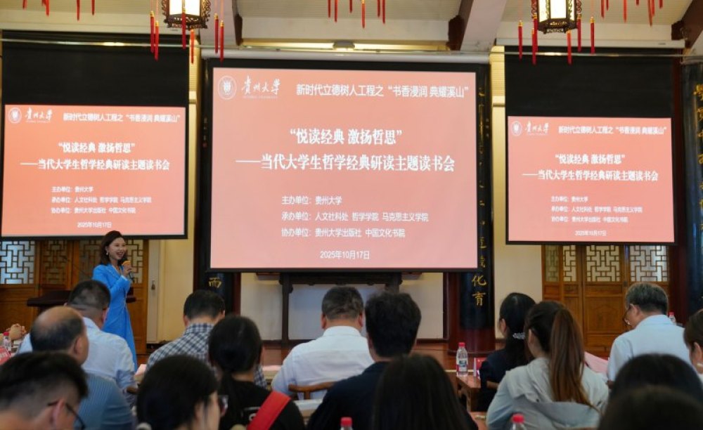 书香弥漫溪山校园,哲思启迪美好人生。10月17日,新时代立德树人工程之“书香浸润·典耀溪山” “悦读经典 激扬哲思”——当代大学生哲学经典研读主题读书会在中国文化书院举行。贵州大学党委书记杨未,贵州大学党委常委、副校长陈艳波出席,复旦大学特聘教授邓安庆、中山大学哲学学院教授陈乔见、南京大学哲学学院副教授韩玉胜、上海社会科学院哲学研究所研究员赵琦、贵州大学哲学学院教授张柯及部分师生代表参加读书会。贵州广播电视台主持人胡丹主持。