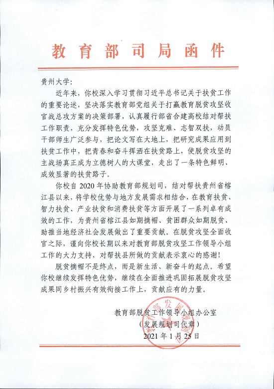 1月25日,教育部脱贫工作领导小组办公室向我校发来感谢函,就我校长期以来对教育部脱贫攻坚工作领导小组工作的大力支持、对结对帮扶榕江县所做的贡献表示衷心感谢。