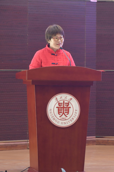令狐彩桃讲话。她说,此次讲座内容丰富,用平实的语言讲述了FAST人的情怀,彰显了开拓进取、勇攀高峰、团结奋进、协同攻关的FAST精神。她希望同学们以南仁东、姜鹏等杰出科学家为榜样,学习FAST精神,踏实干、勇担当、有作为,在加强自身本领的同时,勇于探索、求知,为贵州大学的发展、为贵州的建设,为国家的强大而努力奋斗。