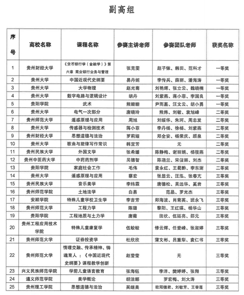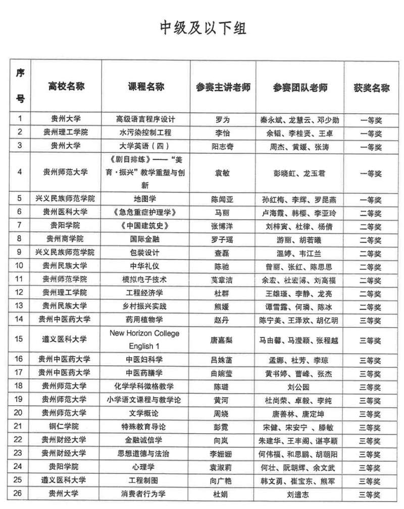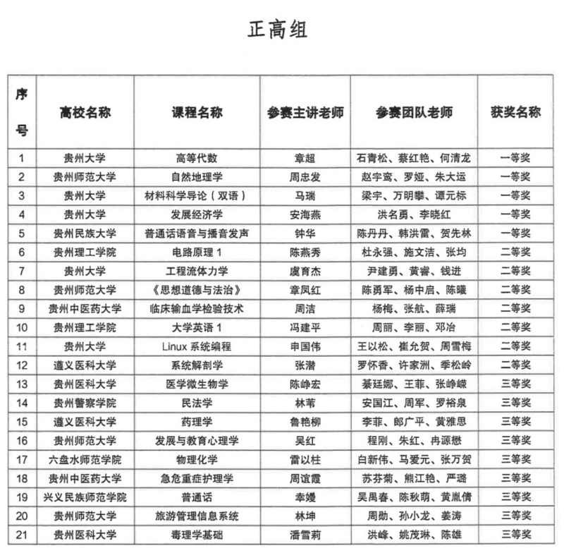 近日,贵州省教育厅高教处公布了《贵州省第二届高校教师教学创新大赛获奖名单》,我校荣获“优秀组织奖”,我校参赛团队分别荣获正高组一等奖3项、二等奖2项,副高组一等奖3项、二等奖3项、三等奖1项,中级及以下组一等奖2项、三等奖1项。