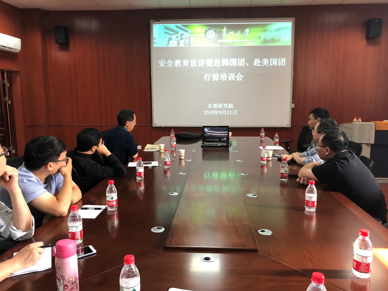2018年9月21日,为有效提高东盟研究院全体教职工的安全意识,我院特邀请贵州省国家安全厅派员对全院教职工开展安全教育宣讲会,暨我院常务副院长崔海洋带队参加2018年韩中国际茶产业发展研讨会一行四人的行前培训会。