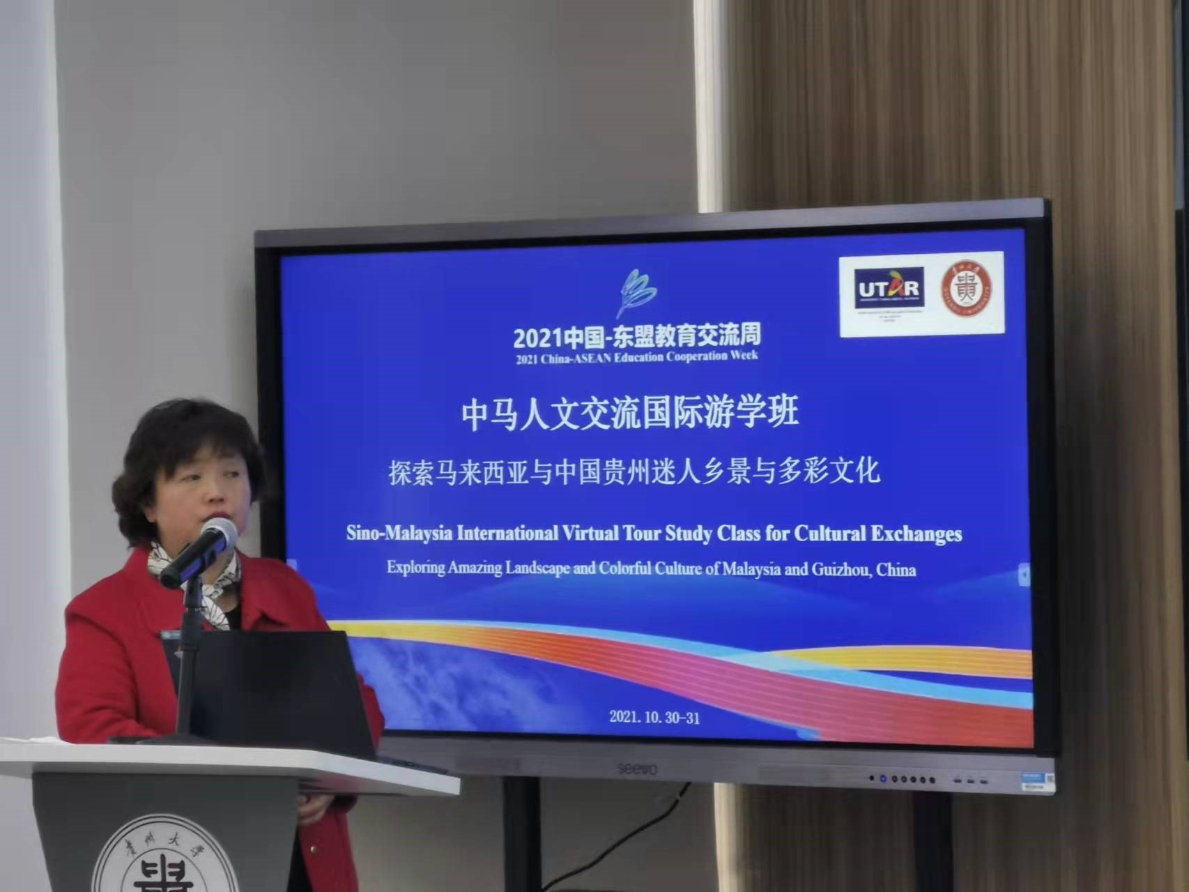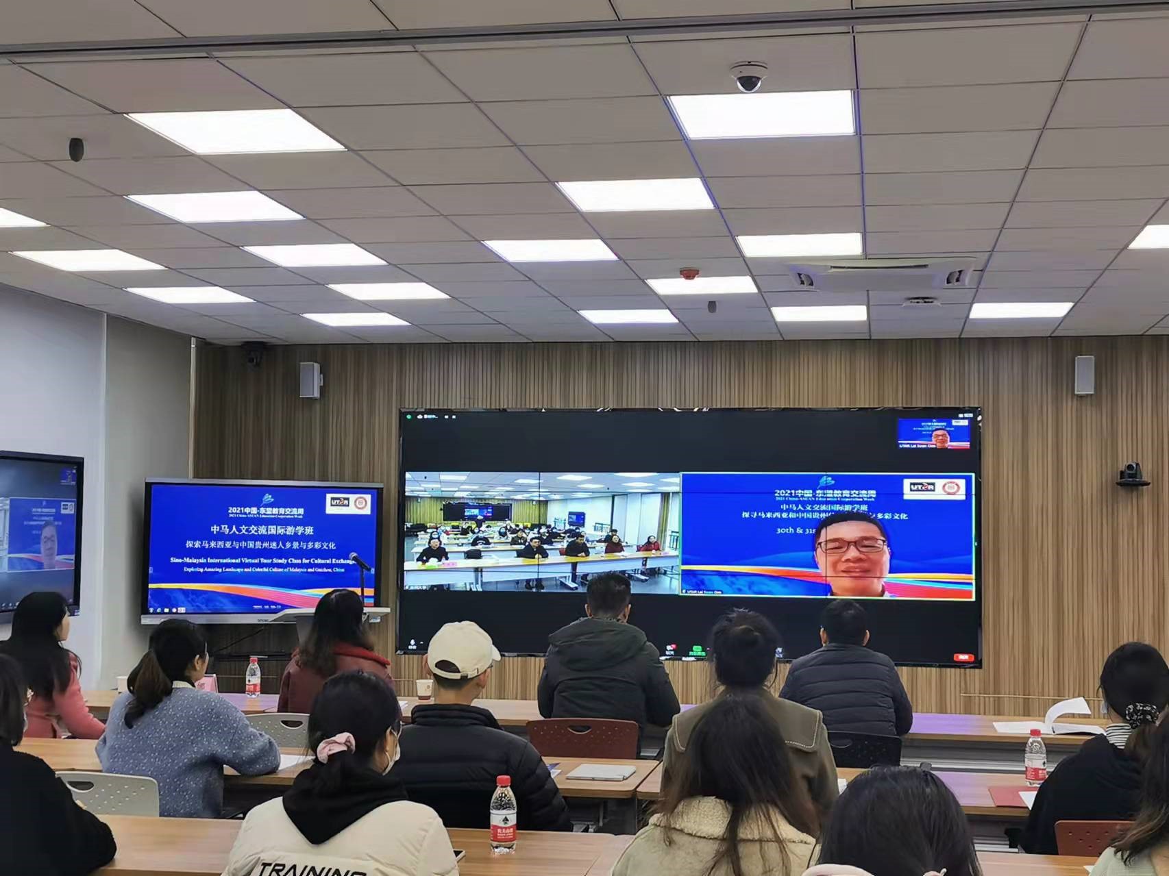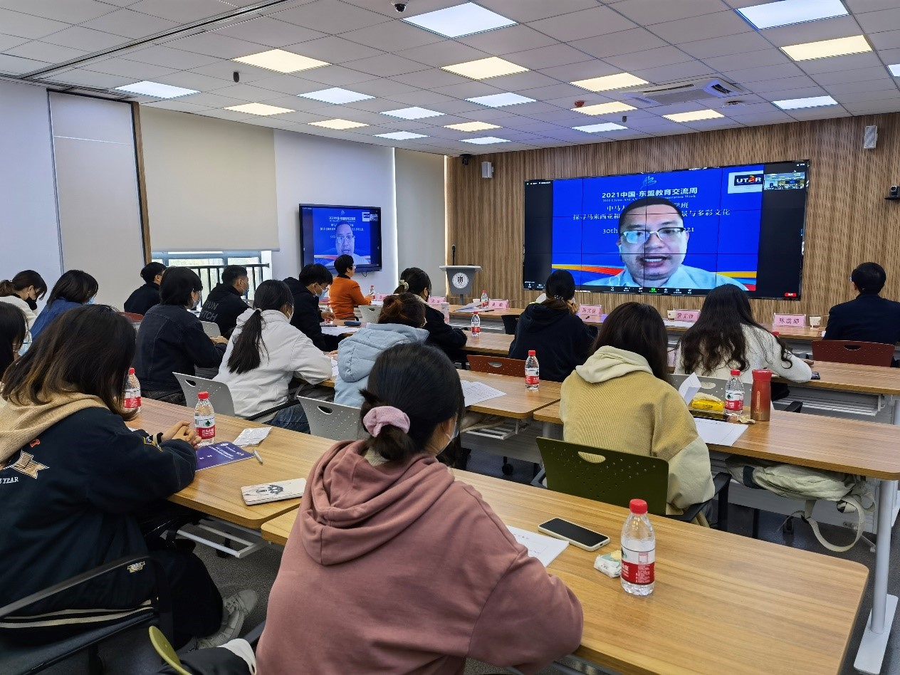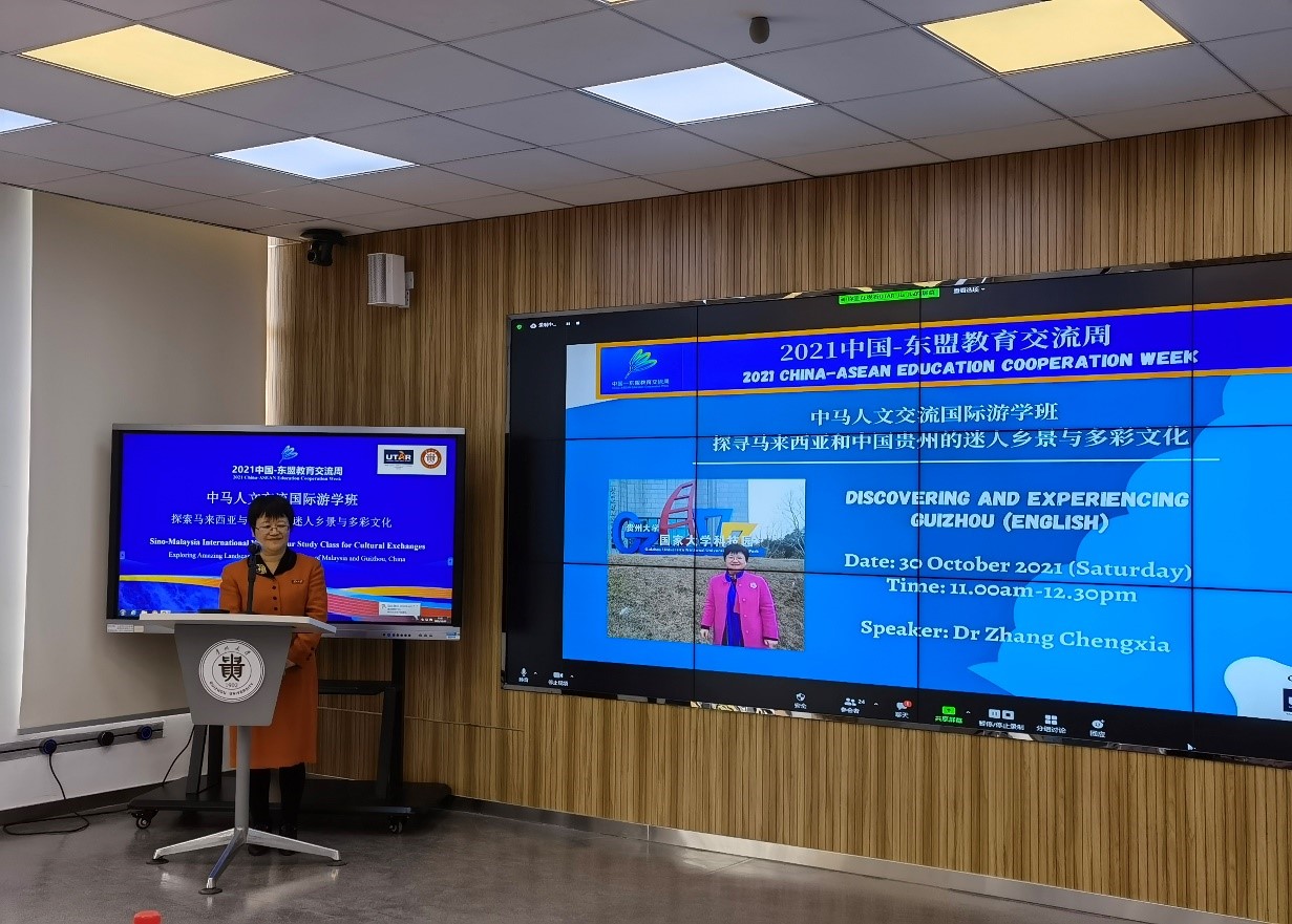 10月30日-31日,由我院与贵州大学国际交流与合作处、马来西亚拉曼大学软技能部联合承办的2021中国-东盟教育交流周全年期项目“中马人文交流国际游学班:探索马来西亚与中国贵州迷人乡景与多彩文化”活动在贵州大学西校区德正楼221智慧教室举办。来自贵州大学、马来西亚拉曼大学的8位主讲嘉宾和来自贵州大学的21名学生、马来西亚拉曼大学的51名学生分别在线下线上参加了此次游学班活动。拉曼大学社区与国际联系处赖顺安(Lai Soon Onn)处长出席了本次活动闭幕式。