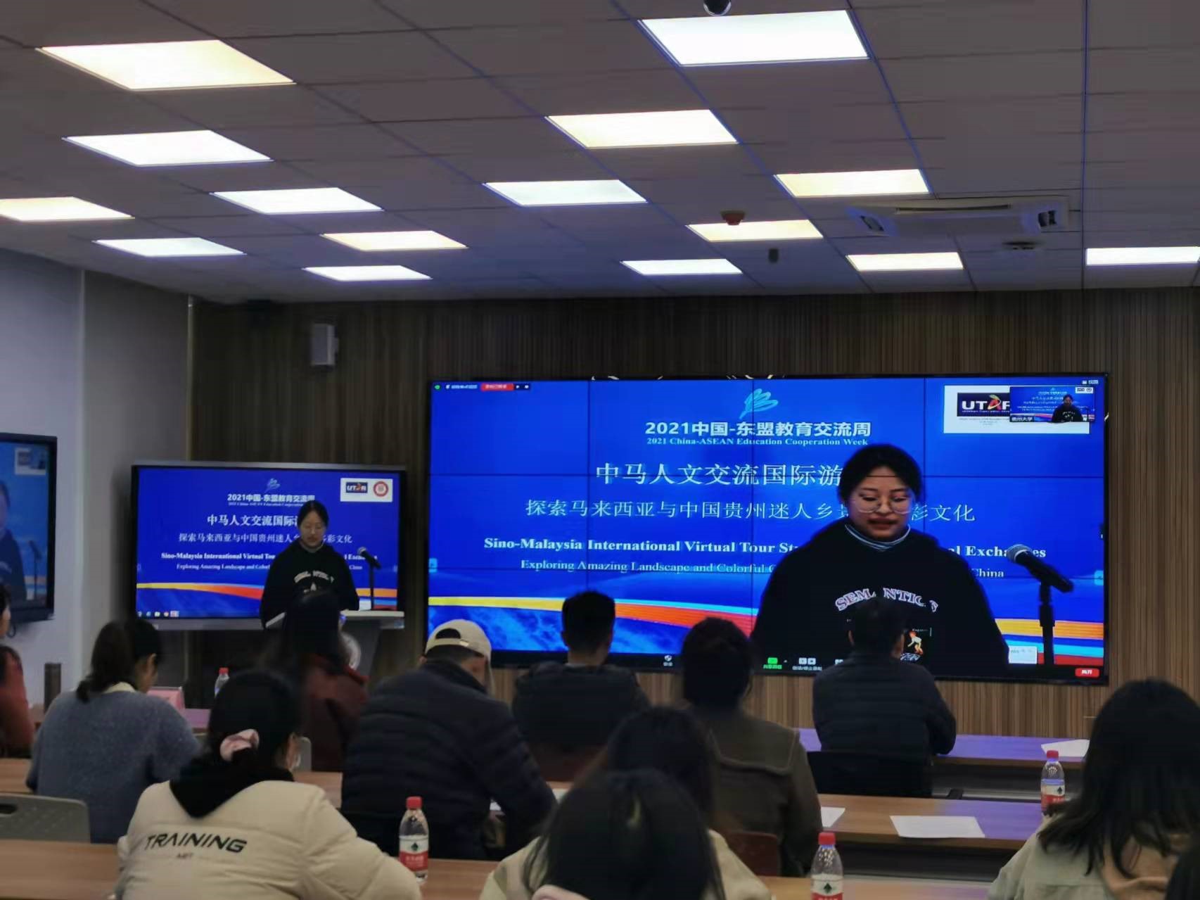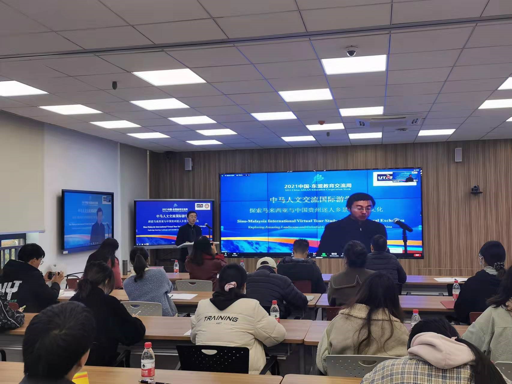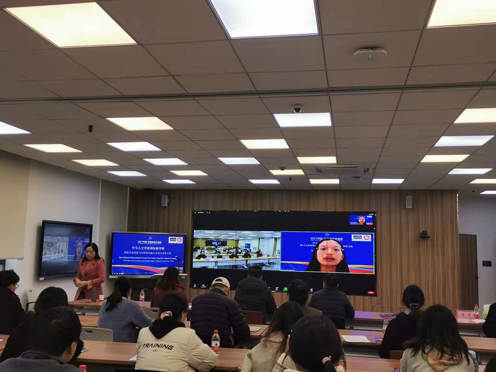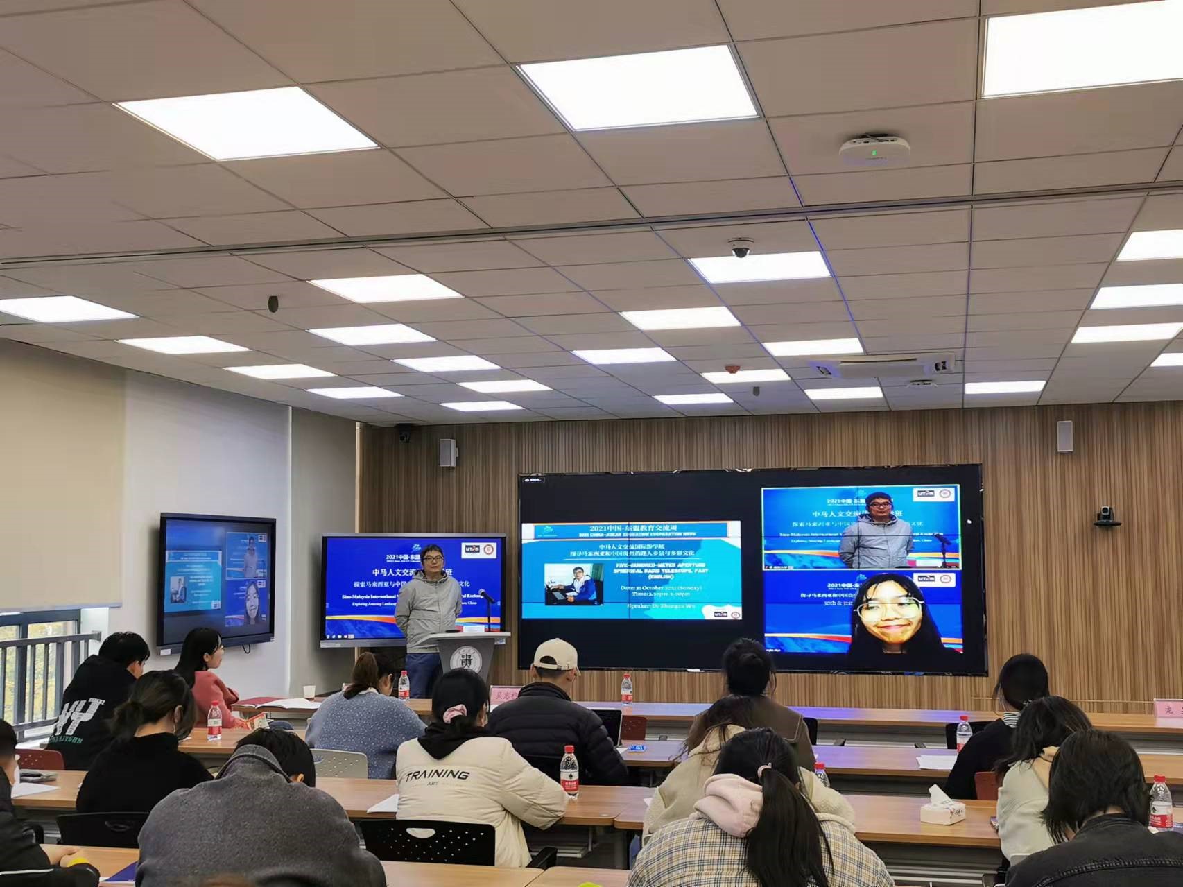 10月30日-31日,由我院与贵州大学国际交流与合作处、马来西亚拉曼大学软技能部联合承办的2021中国-东盟教育交流周全年期项目“中马人文交流国际游学班:探索马来西亚与中国贵州迷人乡景与多彩文化”活动在贵州大学西校区德正楼221智慧教室举办。来自贵州大学、马来西亚拉曼大学的8位主讲嘉宾和来自贵州大学的21名学生、马来西亚拉曼大学的51名学生分别在线下线上参加了此次游学班活动。拉曼大学社区与国际联系处赖顺安(Lai Soon Onn)处长出席了本次活动闭幕式。