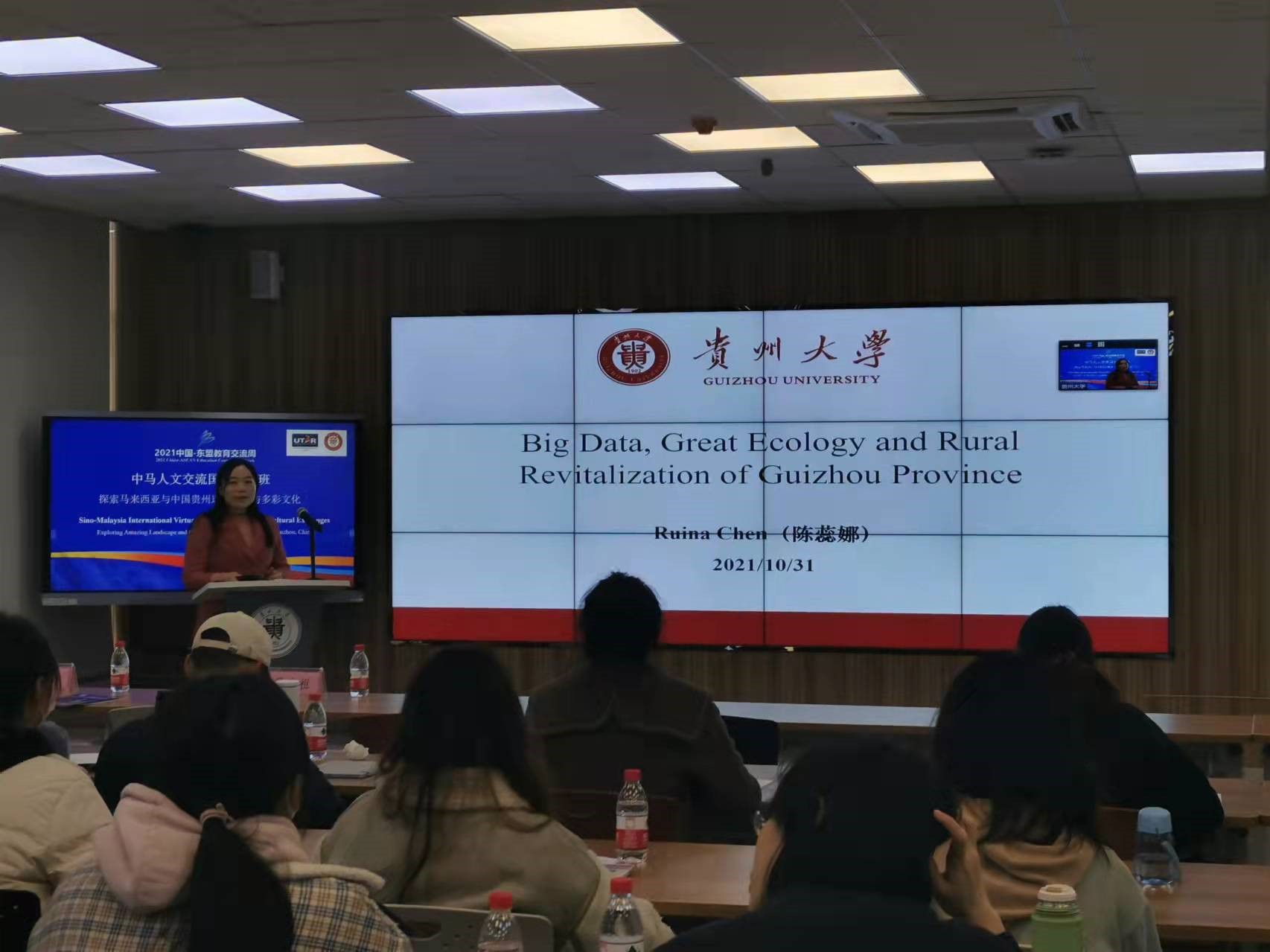第七场专题讲座由贵州大学陈蕊娜老师用英文分享“贵州‘新’三大战略行动:乡村振兴、大数据、大生态”。陈蕊娜老师着重分享了贵州大数据、大生态和乡村振兴的成果。