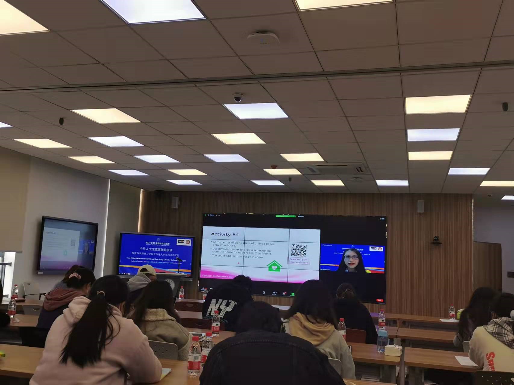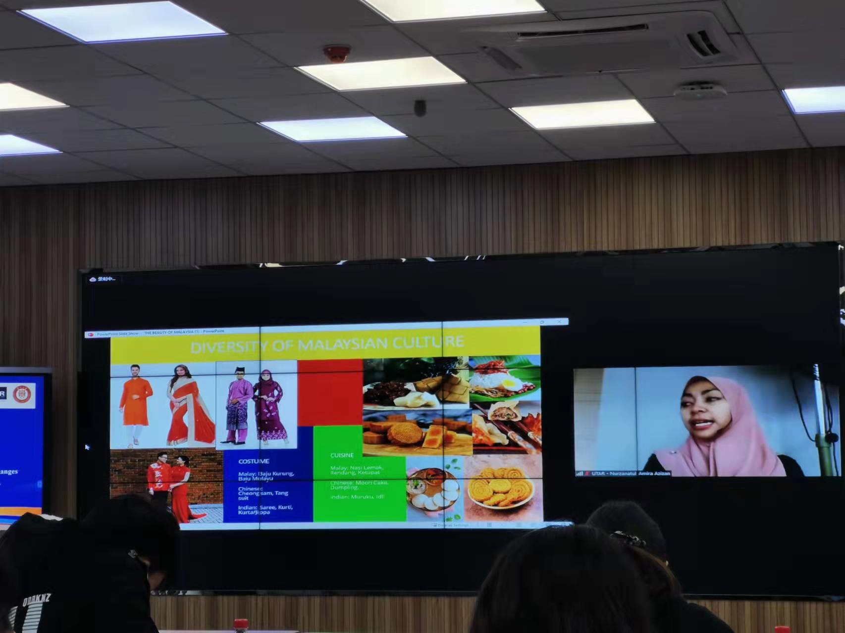 第五场专题讲座由马来西亚拉曼大学Nur Farahin Binti Bahari和Nurzanatul Amira Binti Azizan两位老师用英文分享“探索马来西亚多彩文化”。两位老师分享了马来西亚马来人、印度人和华人的分布情况和各自的传统服装和文化,尤其通过视频教学展示了马来人的传统舞蹈ZAPIN。
