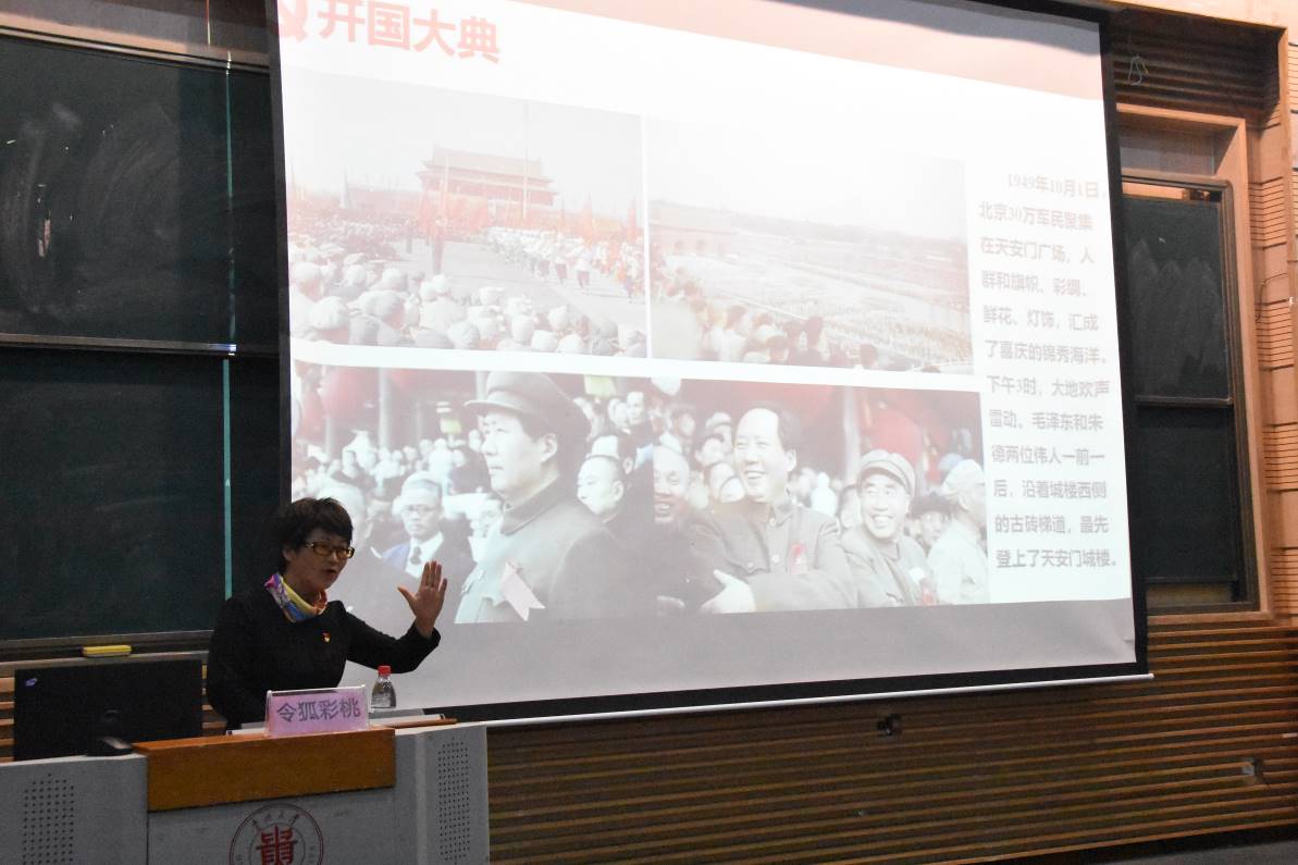 通过师生共同演唱、朗诵等互动方式,充分展现了中国共产党带领人民群众翻身解放的伟大征程。师生党员积极参与,现场气氛十分热烈。党课中,令狐彩桃副书记强调,要牢记习近平总书记对中国青年的谆谆嘱托, “实践充分证明,中国青年是有远大理想抱负的青年!中国青年是有深厚家国情怀的青年!中国青年是有伟大创造力的青年!无论过去、现在还是未来,中国青年始终是实现中华民族伟大复兴的先锋力量!”。广大青年学子要以习近平新时代中国特色社会主义思想为指导,不忘初心、牢记使命,树立远大理想、热爱伟大祖国、担当时代责任。
