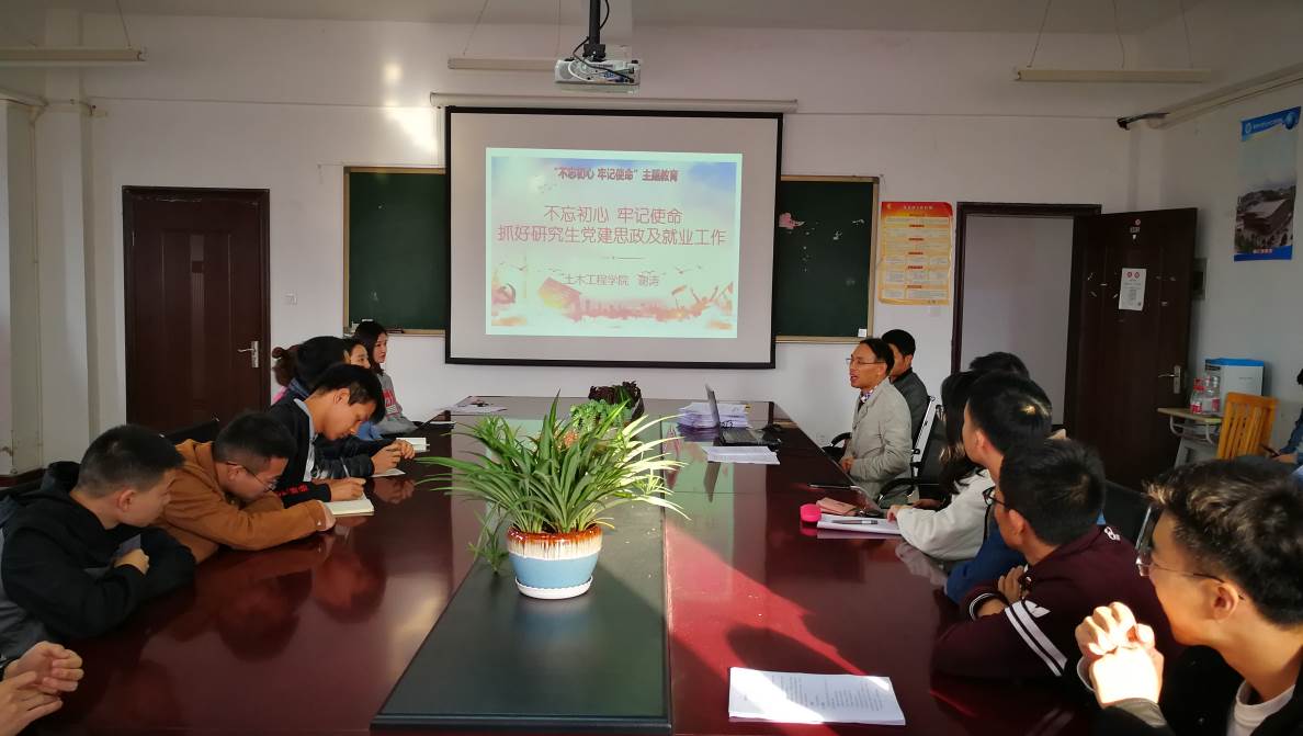 【副院长谢涛上专题党课111午,土木工程学院党委在土木401会议室举行“不忘初心、牢记使命”主题教育专题党课。副院长谢涛以“不忘初心 牢记使命抓好研究生党建、思政、就业工作”为题上专题党课。院学生科、研究生党总支、研究生各支部党员代表50余人参加。