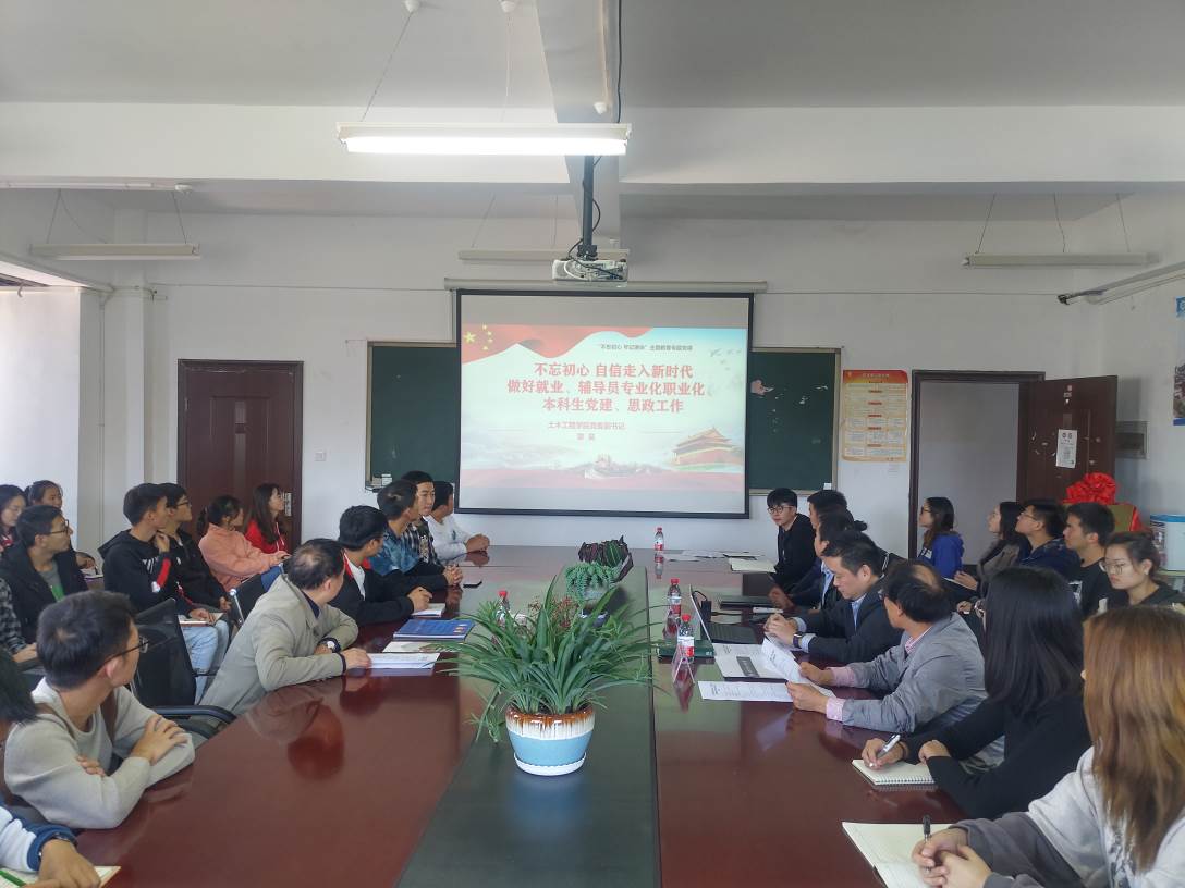 【校第四巡回指导组组长许道云教授莅临现场指导】2019111午,土木工程学院党委在土木401会议室举行“不忘初心、牢记使命”主题教育专题党课。党委书记覃昆以“不忘初心 自信走入新时代 做好就业、辅导员专业化职业化、本科生生党建、思政工作”为题上专题党课。校第四巡回指导组组长许道云教授莅临现场指导,学院组织员学生科辅导员,研究生2018级支部党员,本科生党总支委员,本科生支部书记、组织委员、党员代表,2018级各班团支书、班长代表60余人参加。专题党课副院长谢涛主持。