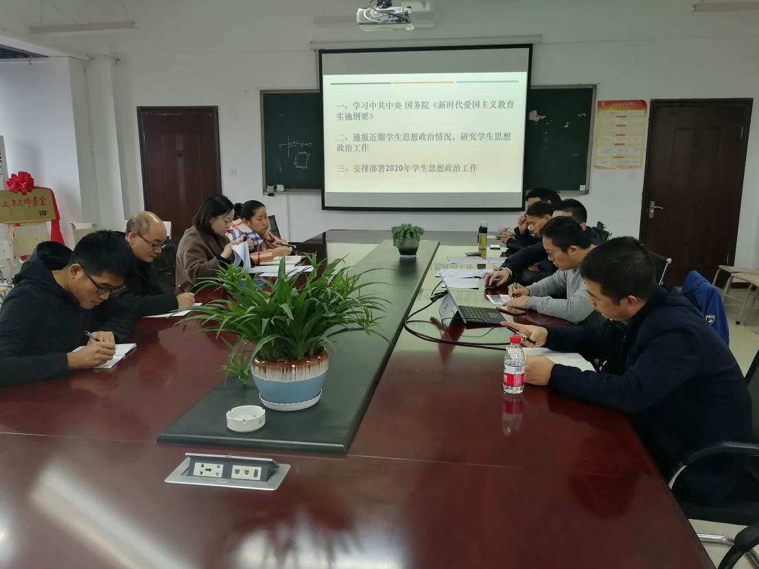会议首先学习了学习中共中央、国务院《新时代爱国主义教育实施纲要》,通报近期学生思想政治情况,研究学生思想政治工作并安排部署2020年学生思想政治工作。