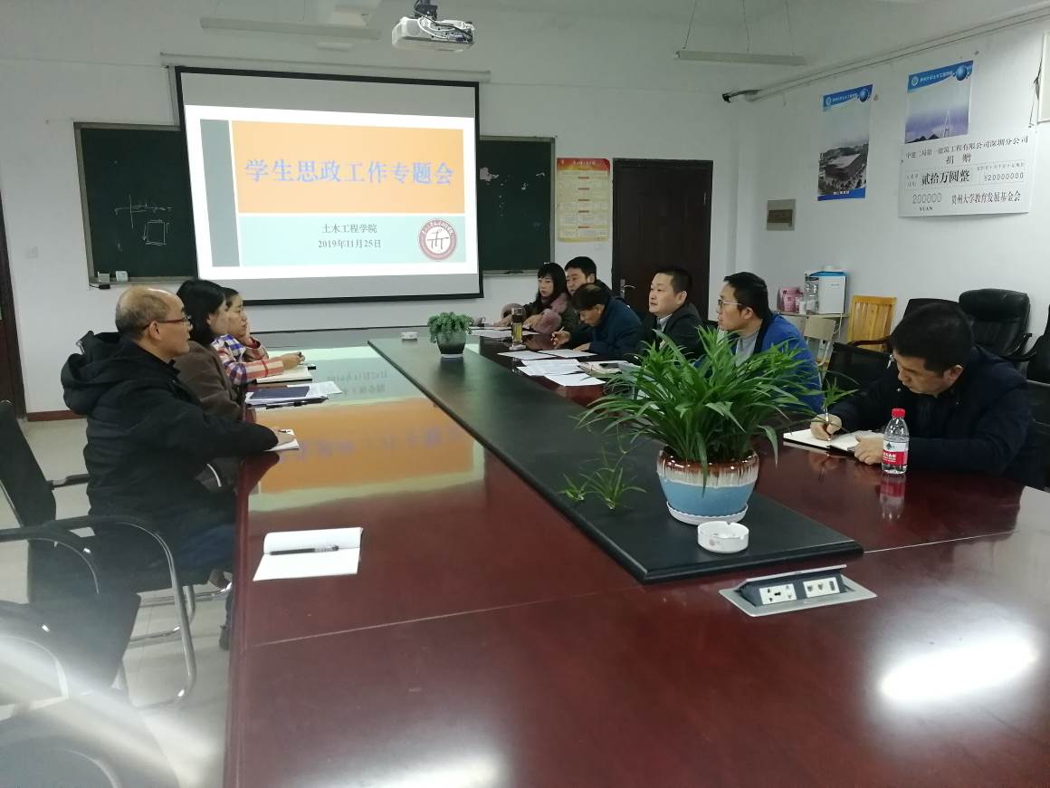 20191125午,在土木工程学院401会议室学院召开会议专题研究学生思想政治工作,会议由院党委书记刘建浩主持,院党委副书记、院长赵瑜,院领导覃昆、魏琛、谢涛、唐晓玲,院学生科、研究生科负责人及辅导员教师参加会议。