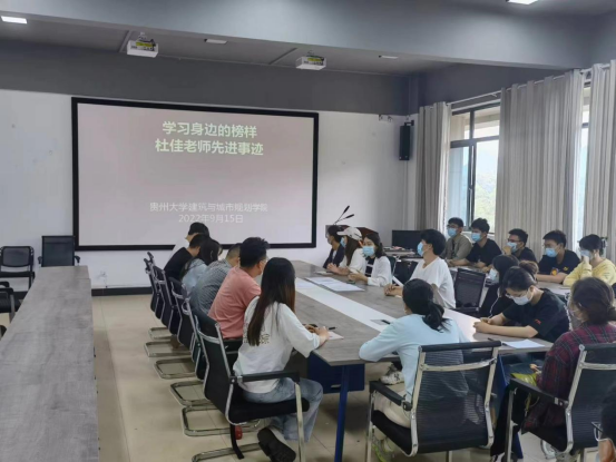 守望相助,共克时艰。在这艰难的时刻,我们更需要榜样的力量。会议上,开展了“学习身边的榜样——杜佳老师先进事迹”,杜佳老师作为贵州大学建筑与城市规划学院教授,硕士生导师,不仅拥有丰硕的学术成果,作为一名优秀的共产党员,更是在疫情期间做出卓越贡献。这鼓舞了在座的各位同学,给予了大家精神力量。