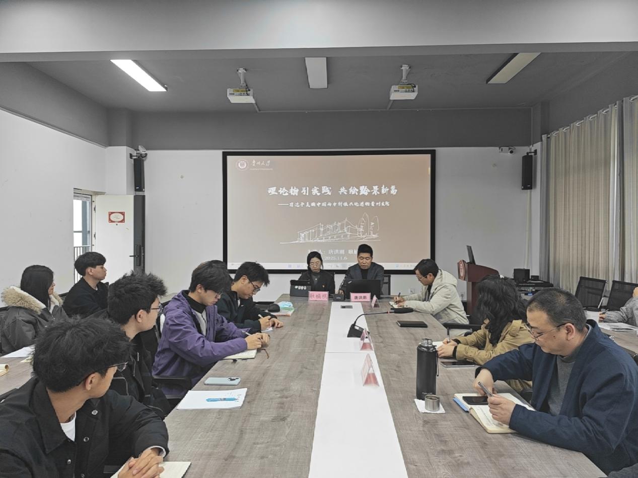 2025年11月6日中午1点,贵州大学建筑与城市规划学院在建规楼418会议室开展了主题为“理论指引实践 共绘黔景新篇”理论宣传二人讲活动。本次活动由建筑与城市规划学院党委副书记(主持工作)龙晓雪主持,学院领导班子、师生代表共50余人参加。此次宣讲由唐洪刚院长和耿楠棋同学主讲,结合《习近平谈治国理政》第五卷以及贵州的实践成果进行了解读。