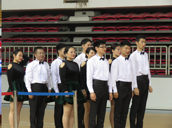 我院参赛队以整齐的步伐,列队走向舞台中央,首先出战,为大家带来现代舞曲《love me do》。伴随着轻快欢乐的乐曲,男女教职工首先分为四列,交叉排布,展现各自美丽的姿态。接着,随着音乐的激昂高亢,教职工们两两组队,伴随着音乐欢快的节奏,展示男女共舞的优雅与激情。跟随着音乐的激昂与舞曲的欢快,现场也传来阵阵欢呼。舞蹈展示完毕后,教职工们集体向主席台鞠躬,再以整齐的步伐列队退场。