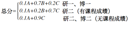 式中:A为思想政治分,B为课程综合成绩,C为科研分,均按百分制计分。