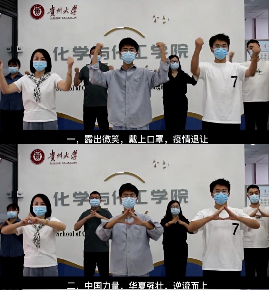 视频以“祝各位同仁双节快乐”拉开序幕,“露出微笑,戴上口罩,疫情退让”“中国力量,华夏强壮,逆流而上”“携手撑网,并肩逞强,不惧风浪”“抬头仰望,必有曙光,燎原四方”……看似简单的歌词与手势,却花费了老师同学们的大量时间精力进行练习,但是为了引导学生张弛有度,尽情释放情绪,保持良好的生活状态,大家还是在很短的时间里经过高频次的反复练习达到了理想的录制效果。