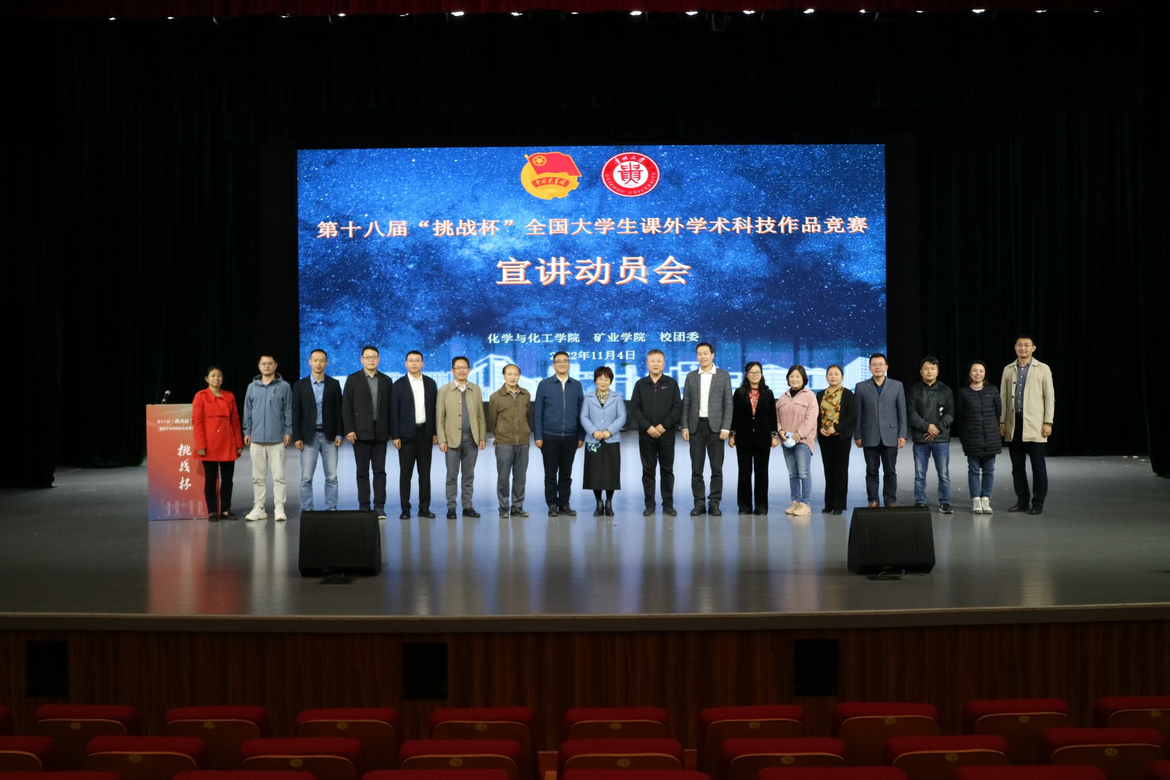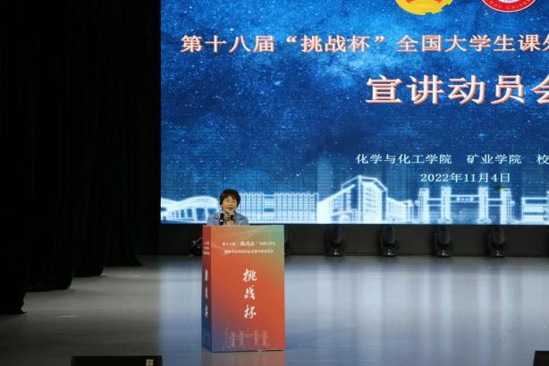11月4号下午14点30分,化学与化工学院、矿业学院在溪山剧场召开了双创工作推进暨第十八届“挑战杯”宣讲交流会。贵州大学党委副书记令狐彩桃、校团委书记刘魁、副书记杨晓椿、校医院副院长毛家志和贵州卡布婴童用品有限责任公司B计划总经理肖蜀黔出席,化学与化工学院党委副书记(主持工作)杨静、副书记方芳、副院长朱必学、副院长肖仁贵、副院长刘飞,矿业学院党委书记张林、矿业学院副院长(主持工作)左宇军、党委副书记陈兴帅、副院长李波波出席此次会议。全体研究生导师及学生共600余人到场,会议由化学与化工学院党委副书记(主持工作)杨静主持。