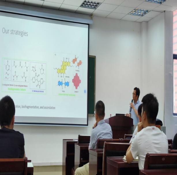然后,王二刚教授从聚合物有机太阳能电池(有机光伏,OPV)、有机发光电化学电池(OLEC)、用于储能的有机、生物与二维材料、可生物降解的共轭聚合物等角度详细介绍了光伏电池的研究策略。王教授以引入烷基链为切入点,探索分子的柔性和变形性,采用二维核磁谱图等方式印证产物结构;还以回收可降解材料为例,引出了电子材料对环境污染的处理方法,为电子产品对环境污染以及回收利用研究和学习提供了启发和思考。