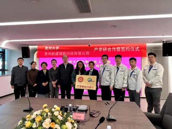 2023年11月8日下午,贵州大学化学与化工学院与贵州航盛锂能科技有限公司(航盛锂能公司)产学研合作签约仪式在航盛锂能公司举行,参加签约仪式的人员有:化学与化工学院党委书记杨静、先进技术研究院院长陈前林、化学与化工学院副院长吕梦岚、化学与化工学院教师李翠芹等,航盛锂能研发副总经理宋飞、销售经理张仰光、胡广宇等。