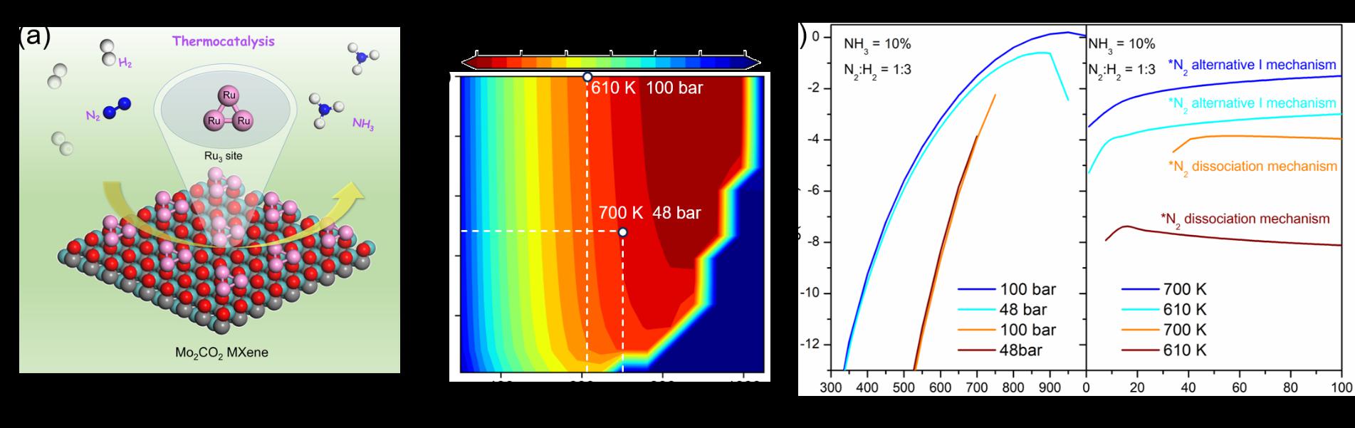 催化剂(Ru3@Mo2CO2)。研究发现,与目前H-B过程中高温高压下直接打开N≡N不同,在表面Ru3团簇上N2可以在温和条件下直接加氢生成NNH中间体,这一反应机理与自然界的生物固氮过程相似。另外,在48 bar和700 K下,N2通过缔合路径在Ru3@Mo2CO2上转化为NH3的TOF高达1.45 × 10−2 s−1 site−1,其性能甚至超过了前人报道的Ru B5位点和Fe3/θ-Al2O3(010)SCC。该催化剂打破了Brønsted-Evans-Polanyi(BEP)标度关系的限制,在温和条件下可将N2高效地转化为NH3。这项工作对对温和条件下的具有原子精确活性位点的单团催化剂的实验研究具有重要的理论指导意义。