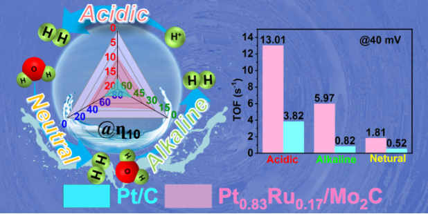该研究工作结合溶剂热法和高温热解法成功将PtRu纳米团簇负载在Mo2C载体上,性能研究发现PtRu/Mo2C纳米复合物在全pH范围内均展现出优异的HER活性和稳定性。理论计算和实验结果表明,具有PtRu双位点的Pt0.83Ru0.17/Mo2C显示出增强的基底相互作用,优化了Pt的电子结构,从而加速了水的解离和氢结合步骤。因此在酸性、碱性和中性条件下,Pt0.83Ru0.17/Mo2C仅需要9、19和33 mV就能实现10 mA cm-2的电流密度(商业Pt/C:17、45和62 mV)。此外,Pt0.83Ru0.17/Mo2C在实际的阴离子交换膜水电解槽(AEMWE)展现出卓越的稳定性,可在500 mA cm-2的条件下工作200小时,显示了其在实际电解水设备中的潜在用途。