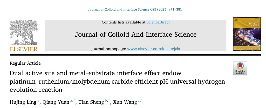 采用电解水制取绿氢对于实现“双碳”目标和可持续发展至关重要。近期,化学与化工学院袁强教授课题组(纳米与能源工程创新课题组)在全pH析氢反应(HER)电催化剂的研究中取得研究进展。该研究结果以“Dual active site and metal–substrate interface effect endow platinum–ruthenium/molybdenum carbide efficient pH-universal hydrogen evolution reaction”为题发表在期刊《Journal of Colloid and Interface Science》上(中科院一区,影响因子9.4)。第一作者为2022级硕士研究生令狐镜,指导老师为袁强教授。